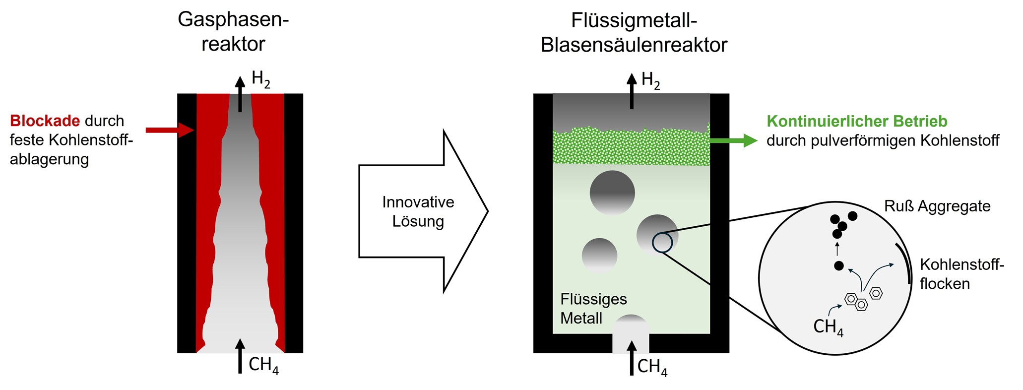 Herzstück der Technologie ist der innovative, flüssmetallbasierte Reaktor, der in der Forschungsgruppe seit vielen Jahren erforscht und weiterentwickelt wird. Details zur den wissenschaftlichen Arbeiten finden Sie unter den unten verlinkten Projekthomepages und in unseren unten aufgelisteten Publikationen. Die Verwendung von flüssigem Zinn als Reaktormedium ermöglicht einen verblockungsfreien Betrieb bei gleichzeitiger in-situ Kohlenstoffabtrennung auf Grund der Dichtedifferenz zwischen Metall und Kohlenstoffpulver.